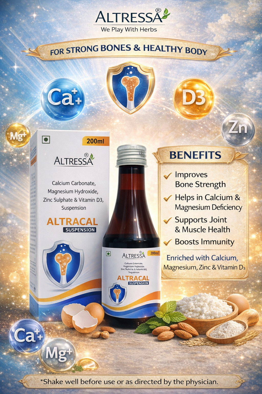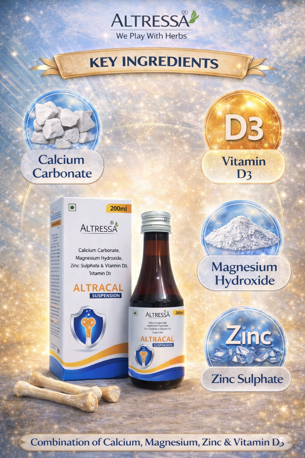 Calcium Carbonate, Vitamin D3, Zinc Sulphate, Magnesium Hydroxide, Preservatives & Syrup Base Q.S