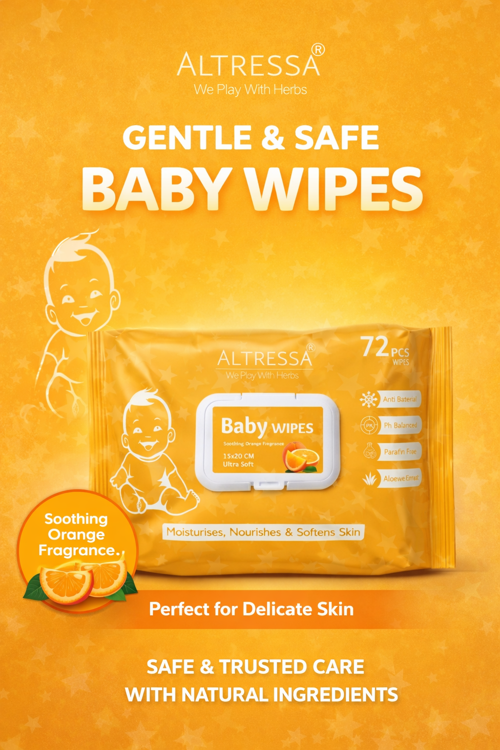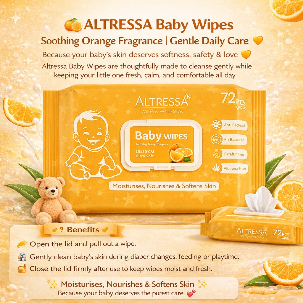 Make everyday care easier and more refreshing with Altressa Baby Wipes — Tangy Orange Fragrance, a trusted choice for happy, clean babies.