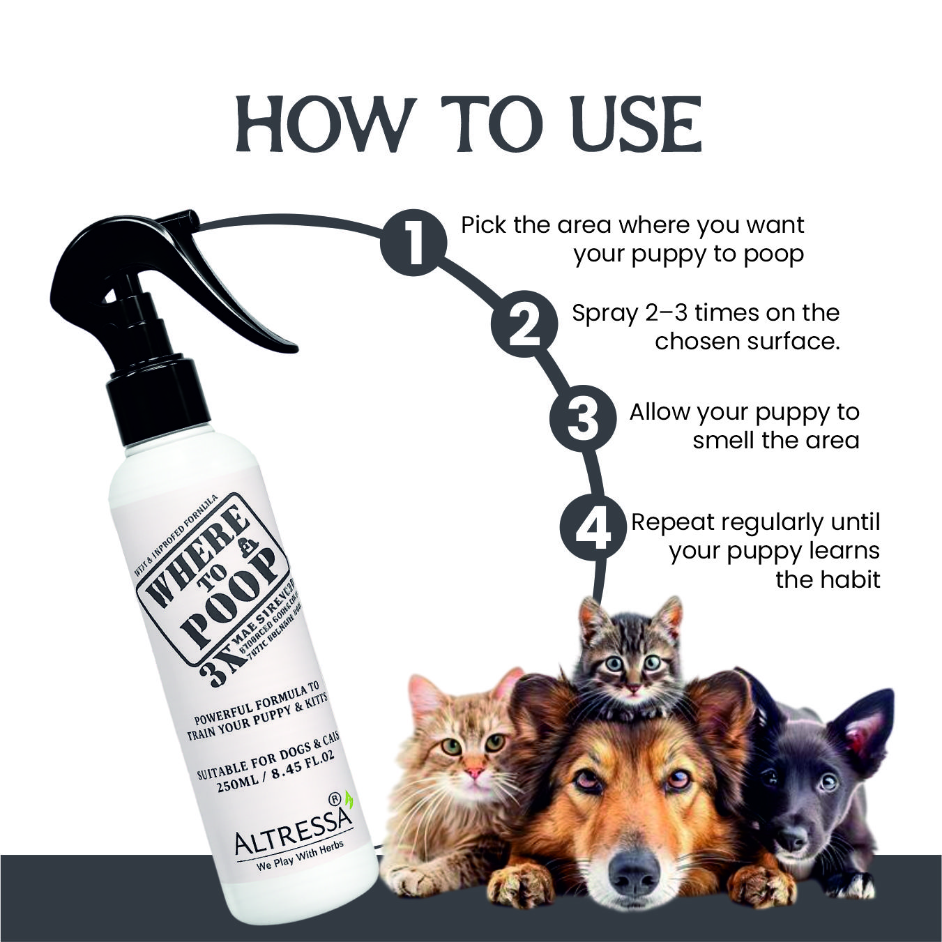 Scent Targeting: Puppies are guided by smell. The spray contains natural attractant or deterrent scents that signal to your puppy where it’s appropriate to go — or not go — to the bathroom.